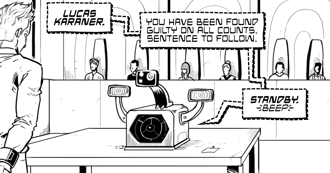 The below panels are a page from Space Precinct Zero #3 that inspired a prologue short film that I’m currently working on. It will detail how CWRS Officer (check the fourth panel for more info!) Lucas Karaner came to be aboard the Precinct and what his general experience is like. Let’s just say it’s not all fun and games for Lucas.